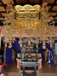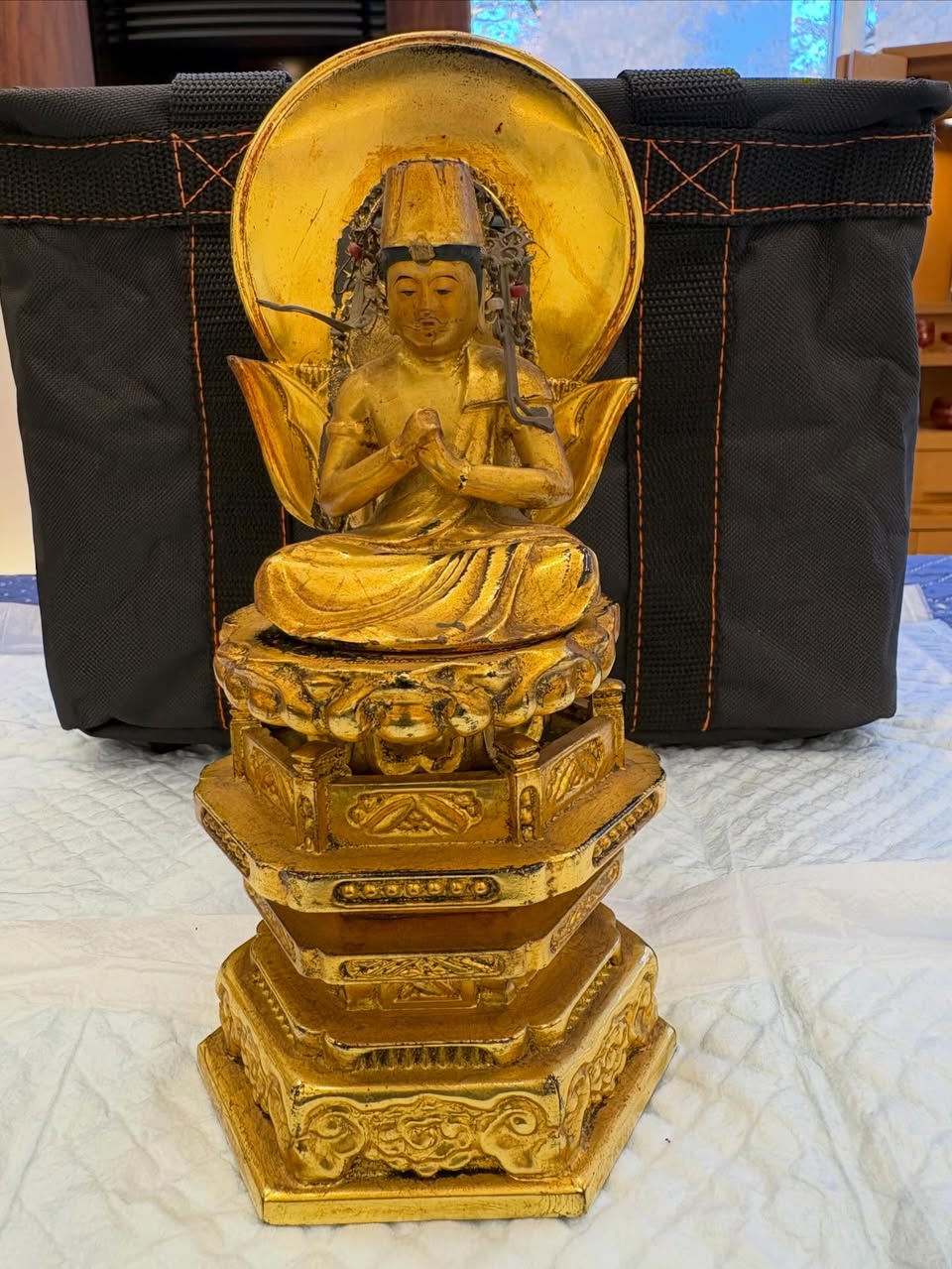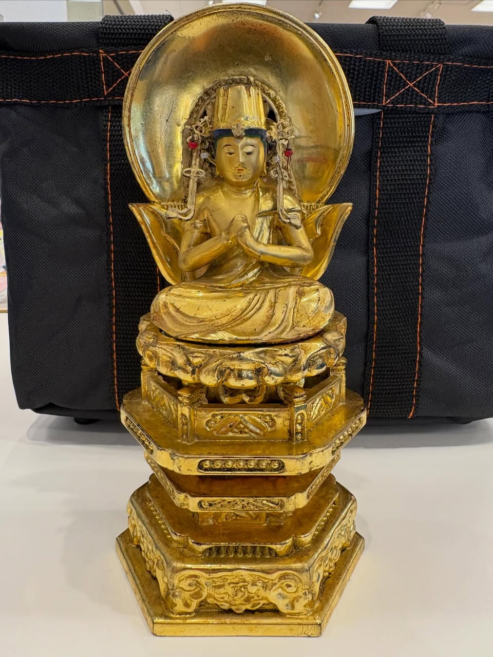 真言宗の御本尊様、大日如来坐像を綺麗にして欲しいとご依頼がありました。金箔が剥がれている箇所がないので表面の汚れだけを落とし、あとは宝冠の一部を修理して完了です。お客さんは大変喜んでおられました。ありがとうございました。
