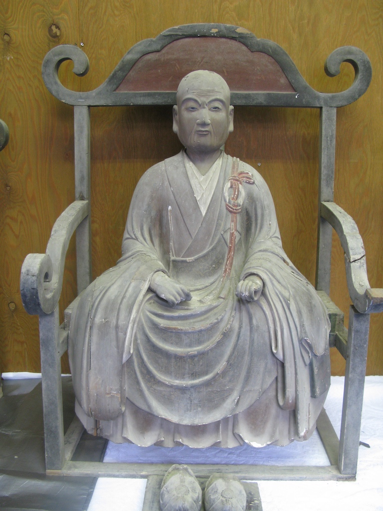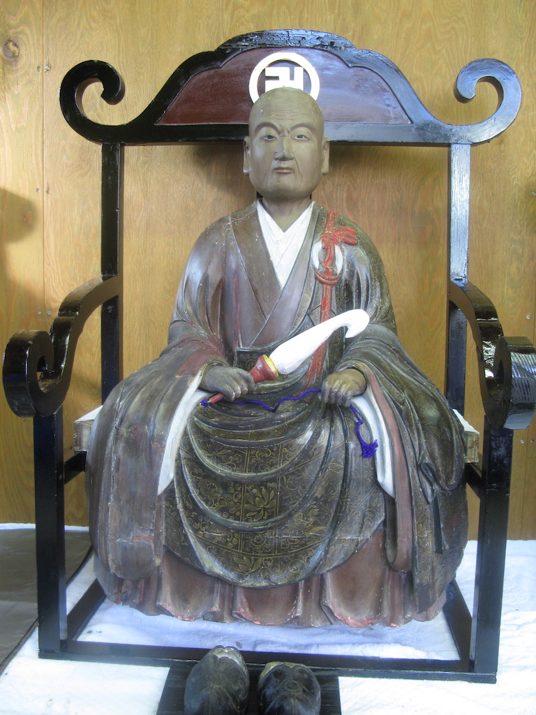 曹洞宗 願成寺様 御開山像洗浄補筆 2026-01-15 最終更新日時 : 2026-01-15 admin_ueda_j 施工前 施工後 模様なしのお袈裟?の御開山像を綺麗にして欲しい 大権修利菩薩像と達磨大師像に比べればそれほど劣化の進んでいない御開山像でした。もう慣れっこなので劣化の進んでいないと書きますが、普通の仏具屋さんではお洗濯しか進めないレベルです。基本的には今のままを綺麗にしたいのが理想ですので、薬剤を使い衣の模様が浮き出るように処置しました。すると細かい細かいデザインが出てきてかなり立派な御開山様でした。衣も薄く彩色を行い違和感のない御開山様が蘇りました。