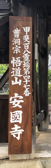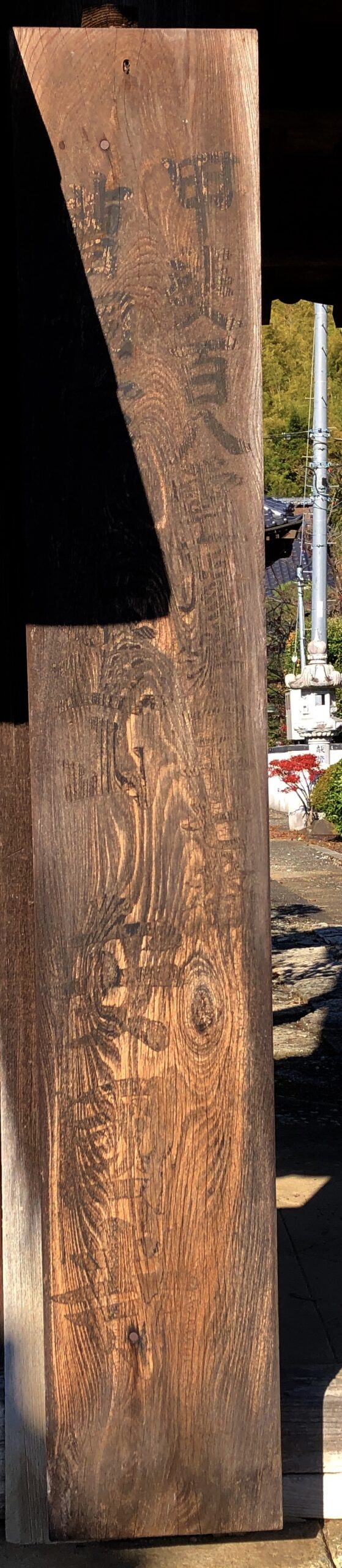 昨年の大掃除の時に寺号額があまりにも汚れていたので濡れタオルで綺麗にしたそうです。ある程度綺麗になったのですが、裏面の寄進者の文字が消えかかったそうで、まだ字が見えているうちにこの字体で綺麗にしておきたいと思い立ったそうです。長年仕事をしていると防衛省のレーザー開発している人とかと知り合いになったりして参謀がたくさんいます。今回はお友達にお願いして、この字体のままレーザー加工、その後白文字入れを行いました。安国寺さんは、長年のお付き合いなので気心が知れていますが、これで一安心だとホッとしておられました。