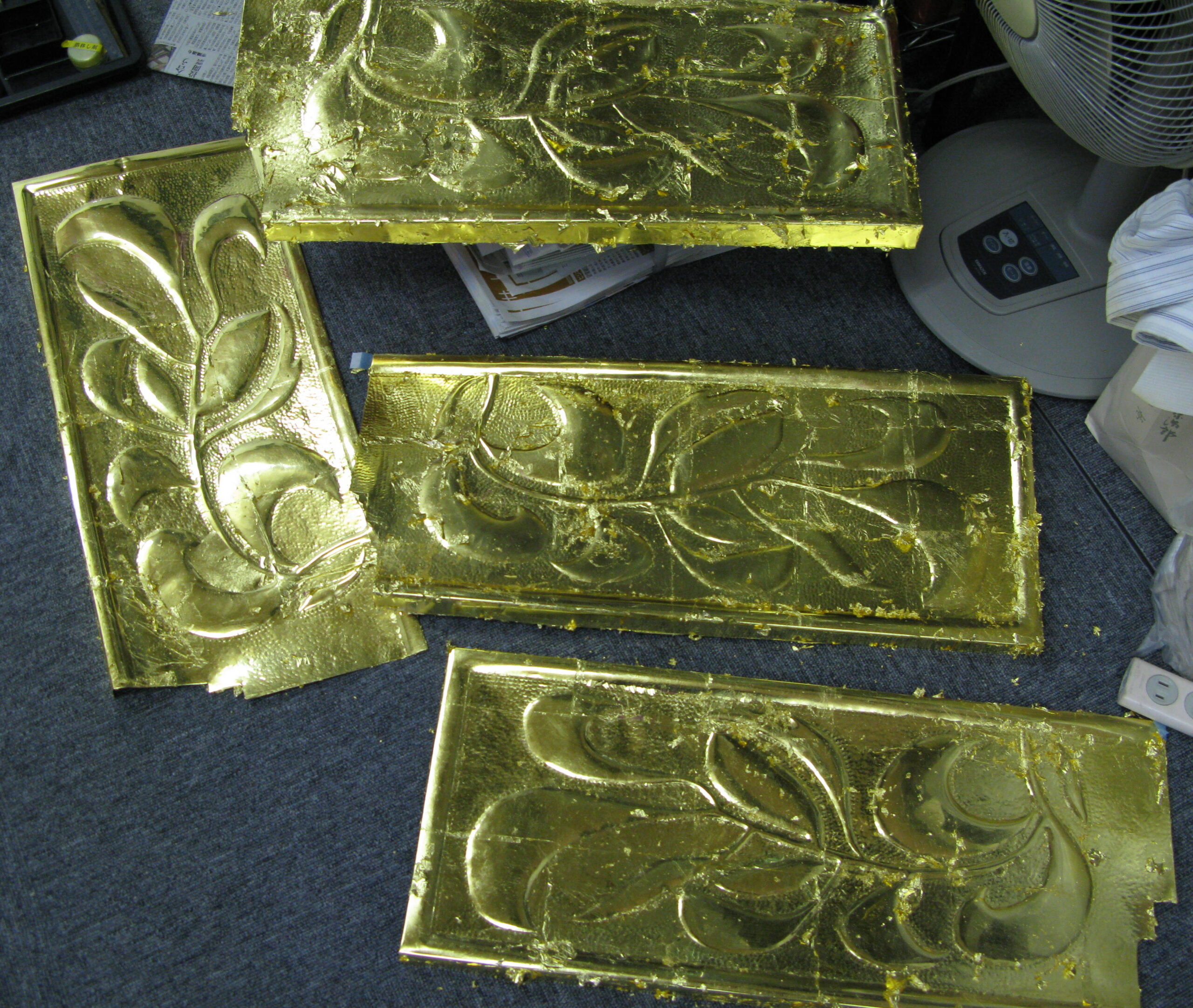 法華宗 本唱寺様 本堂飾り箔押し 2026-01-14 最終更新日時 : 2026-01-14 admin_ueda_j 施工前 施工後 寺院建築の方から本堂の飾りに箔押しして欲しいと頼まれました。要するに下請けです。ここには一枚しか写ってませんが、大きいものは40cmx80cmだったり、数も大量だったりで大変な作業でした。屋外設置ですので雨風に耐えるようにコーティングしました。海沿いのお寺さんですがたまに通るときは寄り道して金具の具合を見ています。まだ綺麗だなって思いながら帰途につきます。