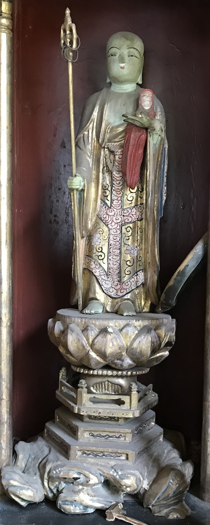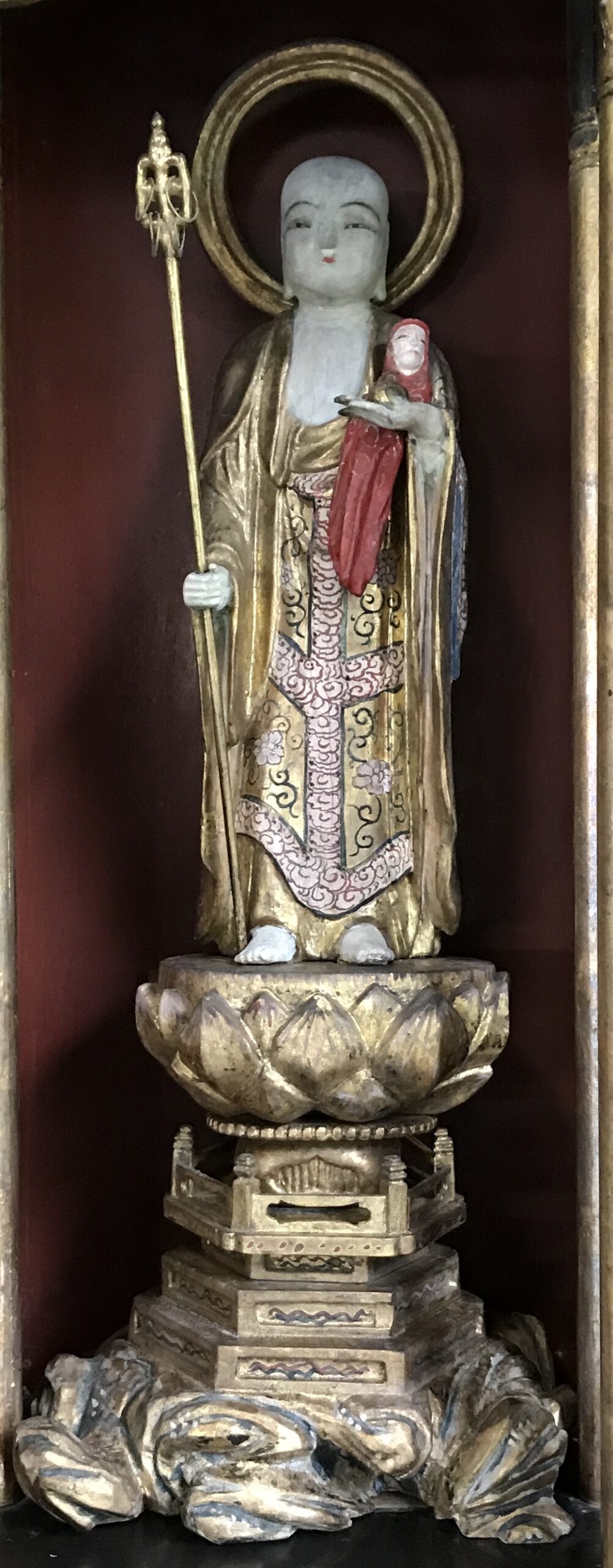 とにかく変わらないように綺麗にして欲しいとのご依頼でした。お顔に少し黒いシミがありそれは気になるから直して欲しいとの事。シミを消しながら彩色しないでってのはある意味矛盾している事ですが、薄く薄く彩色して和尚さんが納得するところで止めました。これは他の業者に出したらできなかったと思います。もちろん光背も付け直して台座も綺麗になったので施工前施工後だとパッと見は変わらなくても随分綺麗になりました。地元では、安産祈願で妊婦さんがよくこの水子地蔵様に手を合わせに来るそうです。今まで全員安産だったから何かあったらウエダさんのせいだよって冗談か本気か言われて苦笑いしてしまいました。