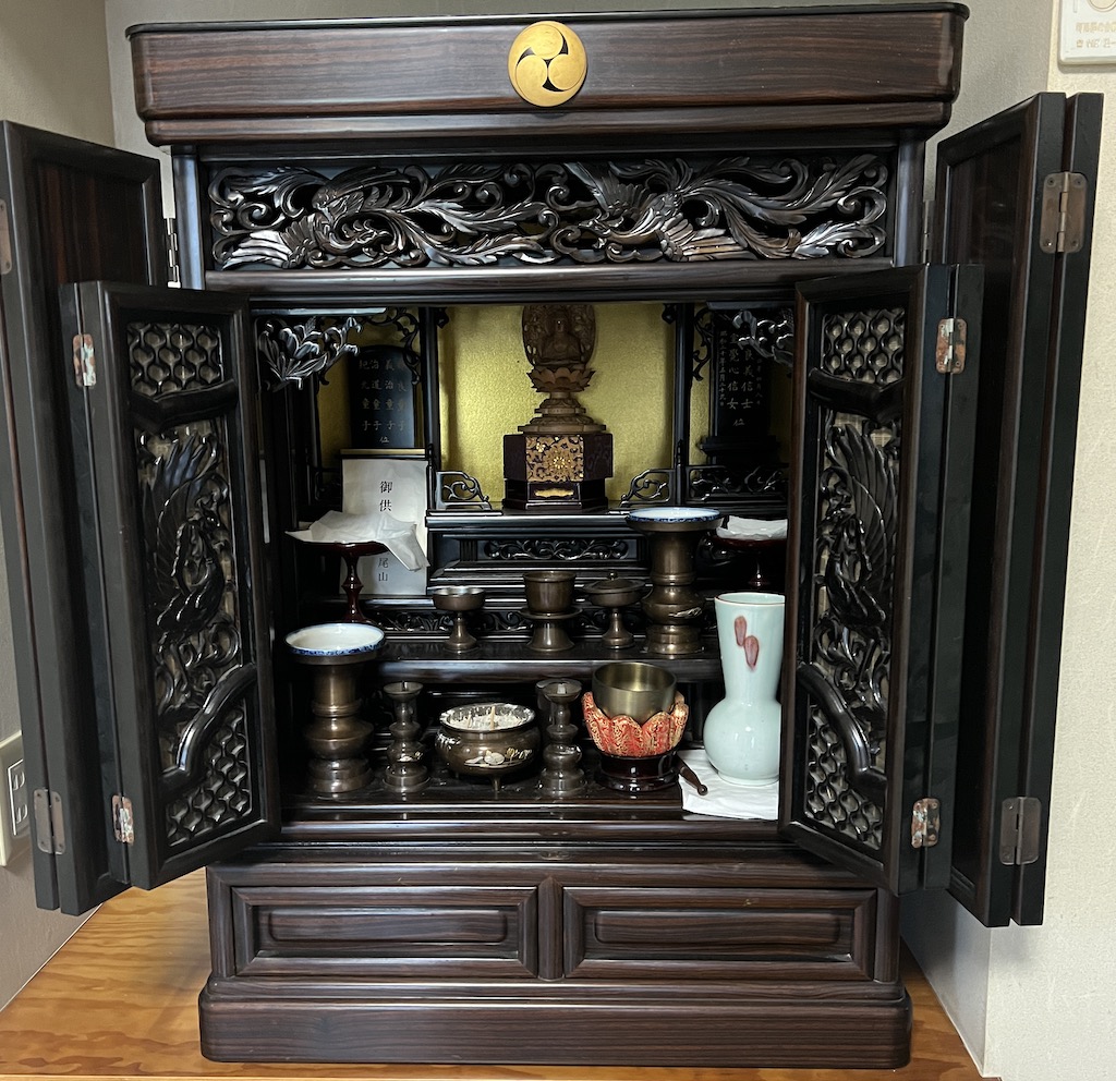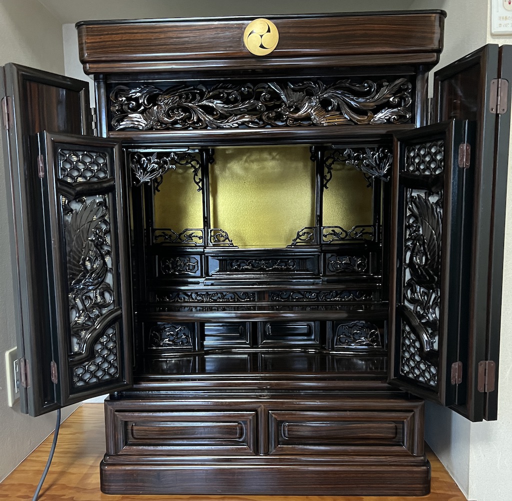 仏壇クリーニング 本間様 2026-01-15 最終更新日時 : 2026-01-15 admin_ueda_j 施工前 施工後 おばあさんの大切にしていた仏壇を綺麗にしてほしい 思い入れのある仏壇を何とか綺麗にしてほしいとお願いされました。黒檀の立派な仏壇で欄間内扉とも黒檀の板に彫りをしてありました。扉の金具が少し錆びていたくらいで他は通常の経年劣化という感じでした。汚れを落として艶を出し、紗を交換するとすっかり蘇りました。これからも大切にしたいとのことでした。ありがとうございました。