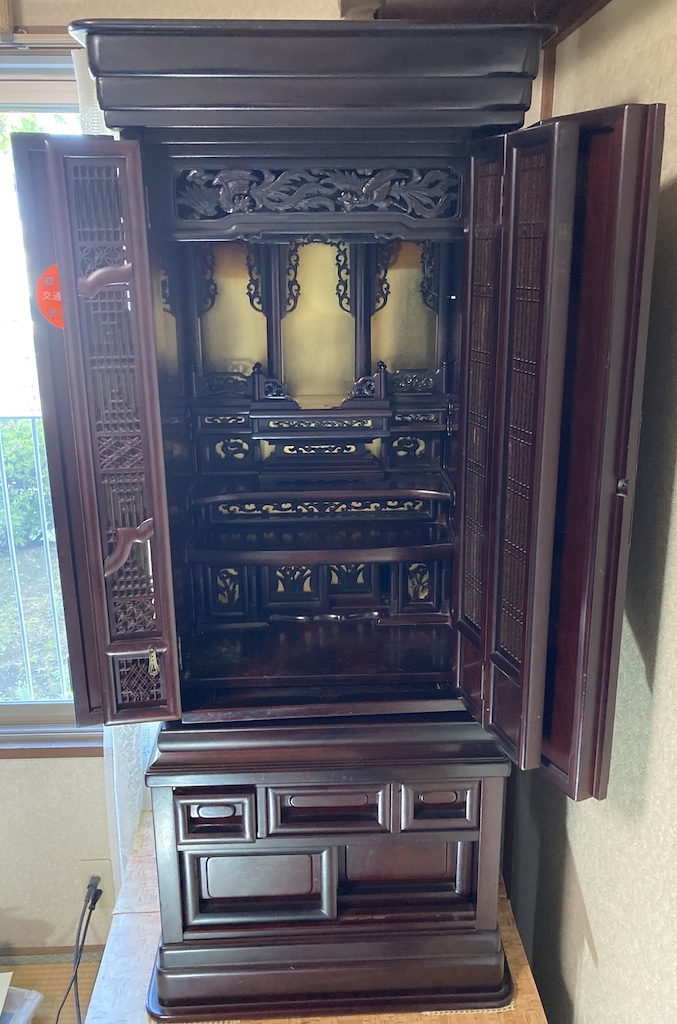 旦那さんが他界されて仏壇を綺麗にしてほしいとご依頼がありました。お子さんがいなくて将来姪っ子に仏壇を引き渡す予定なので私が生きている間に綺麗にしておきたいとのことでした。金紙の交換、紗の交換、全体の洗浄艶出しをしたらすっかり綺麗になり、これで引き渡せるわと満足しておられました。
