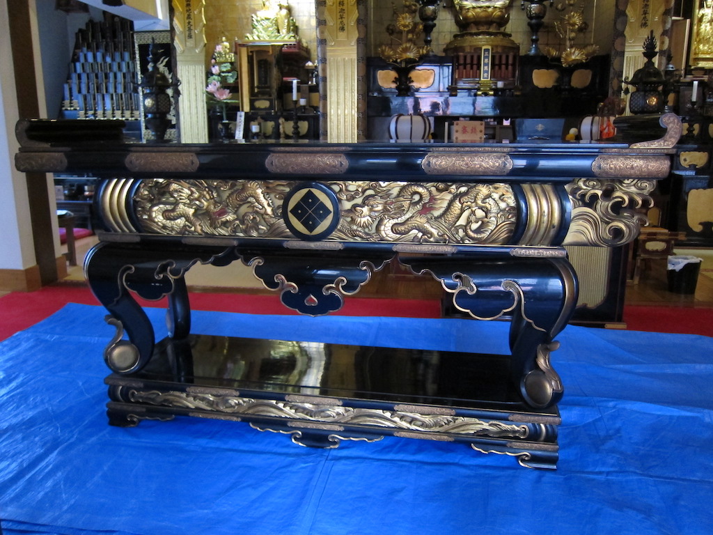 天台宗 円楽寺様 前机洗浄 2026-01-21 最終更新日時 : 2026-01-21 admin_ueda_j 施工前 施工後 六本木近くの円楽寺さんから前机の洗浄依頼を受けました。傷みがそれほどないため漆磨きと金箔・金具の洗浄をしました。八百屋お七の菩提寺のため妙な緊張感に包まれての作業となりました。小さいお寺ではありますが作りはしっかりしており無住のお寺とはびっくりしました。, 仏像, 修復, 洗浄