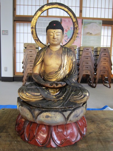 浄土宗 光福寺様 阿弥陀如来像洗浄 2026-02-04 最終更新日時 : 2026-02-04 admin_ueda_j 施工前 施工後 歴史を感じさせる仕上げをとのことで洗浄のみ行いました。台座は朱漆でしたので漆磨きを行いました。肩・膝のところは汚れが層になって付着しており金箔を剥がすスレスレのところでストップしました。金箔が剥がれてしまうと平成の金箔を押す必要があり、ご要望と異なってきますので和尚さんと相談しての仕上げにしてあります。ここまでくすんでいた御本尊様が綺麗に蘇り大変喜ばれました。, 仏像, 修復, 洗浄