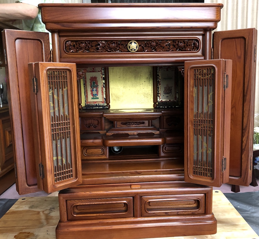 仏壇クリーニング 堀口様 2026-03-02 最終更新日時 : 2026-03-02 admin_ueda_j 施工前 施工後 お父様が亡くなられた時に購入された仏壇でした。この度お母様が亡くなられたのでお母様の入るお家を綺麗にして欲しいとご依頼がありました。ケヤキの上置き仏壇ですが、汚れが目立ちにくい感じではありますが全体が茶色くなっていました。木目もそれほど出てないのが明らかでした。あと。経年劣化で金紙がヘタっていました。洗浄すると色が購入当時に戻り、そう言えばこんな感じだったねと施主様も言われておりました。お母さんも綺麗になったおうちに入れて嬉しいんじゃないかなとニコニコされておっしゃられたのが印象的でした。