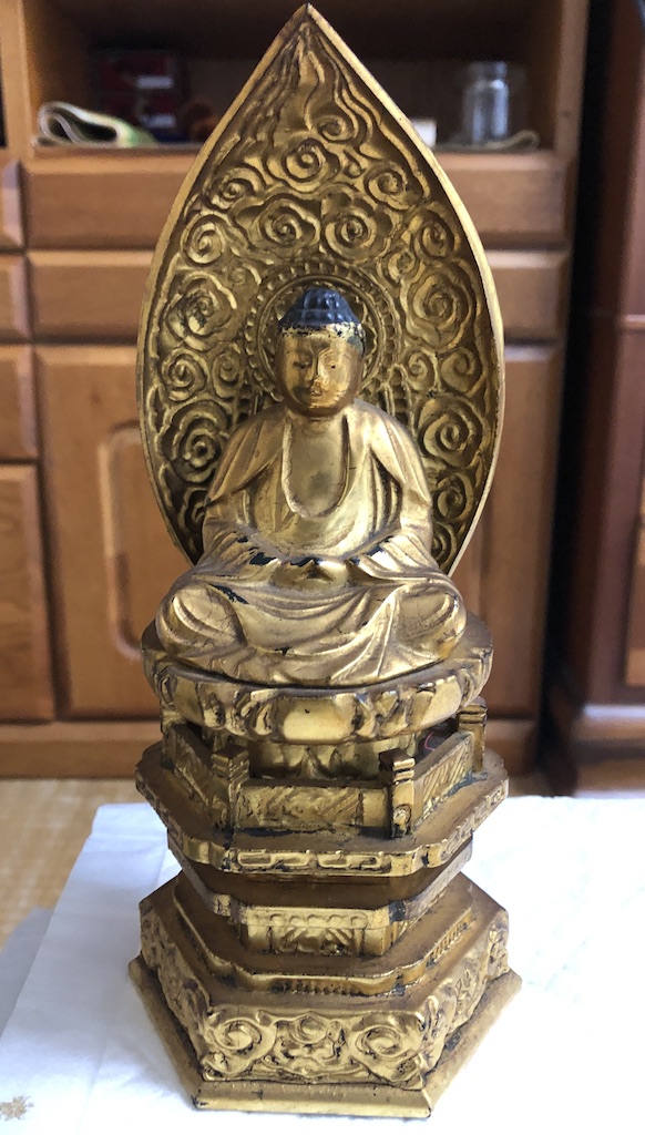 在家仏像クリーニング 大野様 2026-03-02 最終更新日時 : 2026-03-02 admin_ueda_j 施工前 施工後 山口の実家から綺麗な仏壇を引き取り位牌等も新調しなおしましたが、ご本尊様だけは新調出来ないということで洗浄の依頼が来ました。臨済宗でしたので釈迦如来坐像でした。ふっくらした面持ちのあまり見かけないタイプでした。一生懸命お勤めされていたらしくやはり茶色く変色していました。洗浄後に仏壇に安置してみると荘厳に見えると大変喜ばれてやってよかったと大満足されていました。