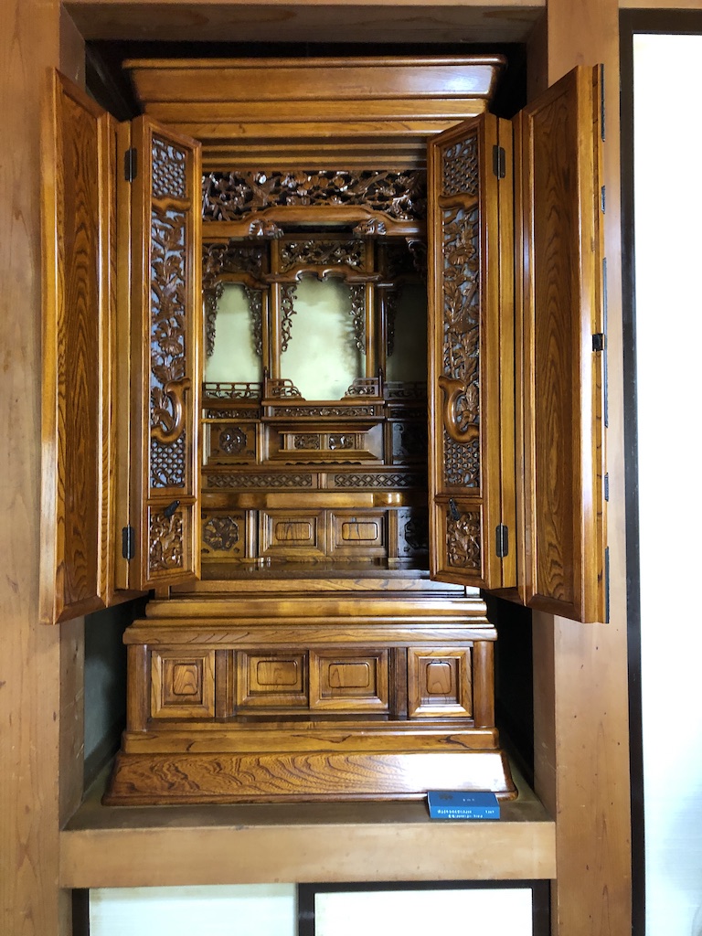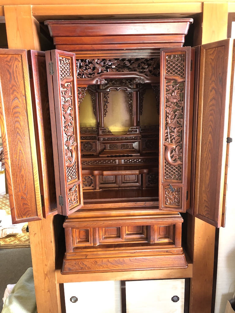 お姑さんが亡くなられた35年前に旦那様が購入された仏壇でした。今回旦那様が亡くなられたということで49日前までに綺麗にして欲しいと奥様からご依頼がありました。一生懸命お勤めされていたそうで全体がかなり茶色く汚れていました。洗浄を始めると、昔はこんな色だったわねとか色々思い出したらしく洗浄しているそばでずっとお話をされていました。私が次に入るだろうから10年くらいはこの綺麗さが持つかね??と言われましたが、全然大丈夫ですよ、あと35年くらいはもつのでそのくらい長生きしてくださいとお答えさせていただきました。位牌も夫婦で作るつもりだそうで、何とも素敵なご夫婦でした。親戚に自慢してくれるそうなのでまたご依頼されることをお待ちしております。