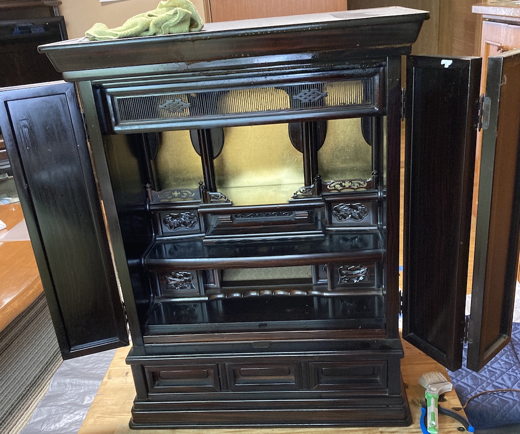 旦那さんがお亡くなりになり、仏壇をきれいにしてから送ってあげたいと奥さんと娘さんからご依頼がありました。パッと見て?と不思議な感じがしたのですが、よく見ると仏壇の内側にネジ穴のあとがありました。他の業者なら面倒くさくなって何も聞かないかもしれませんが、わかった以上そうはいきません。聞いてみると、内扉の網戸が汚れてきたし穴が空いてきたので外してどこかの奥にしまってあるとの事でした。普通は内扉を付けますしきれいに戻せるので探してもらえますか?とお願いして戸棚から出してきてもらいました。網戸を交換して全体を洗浄して艶出しをしたら本来ある姿に戻りました。やっぱり内扉あると重厚感が増して綺麗ねと言われました。お役にたててよかったです。