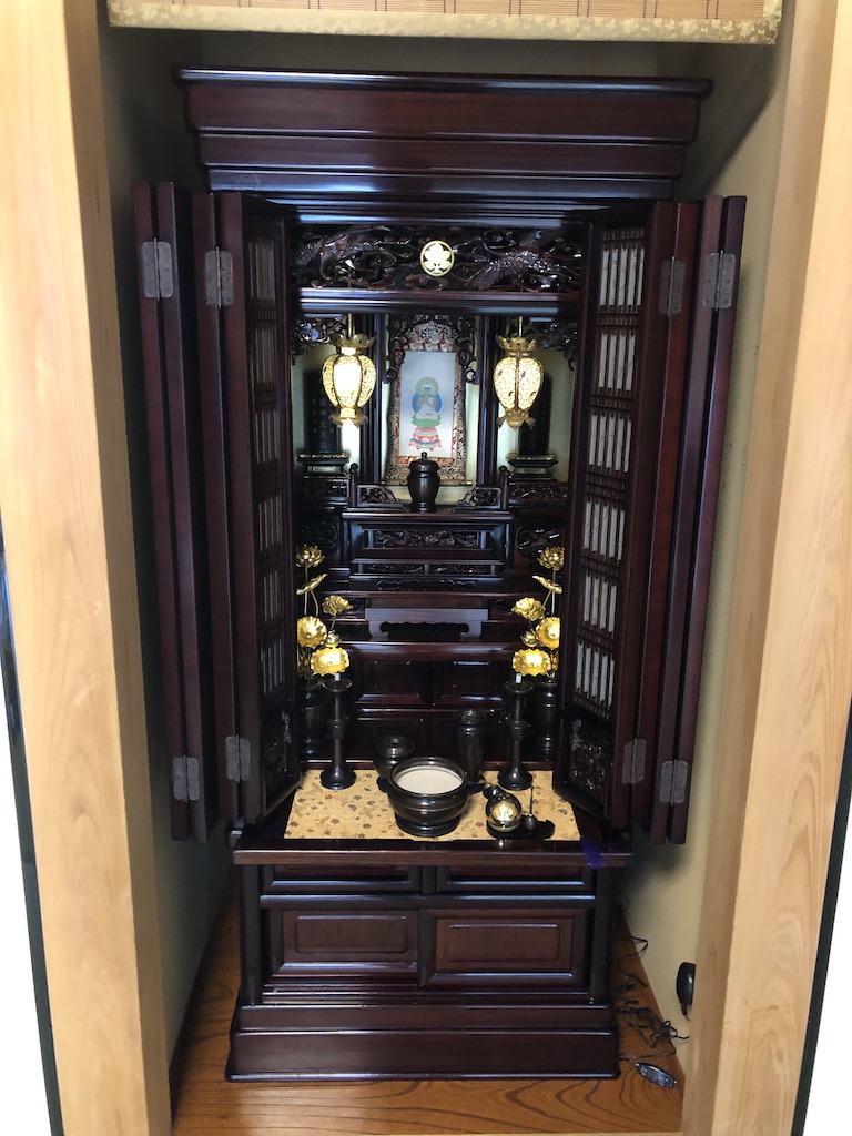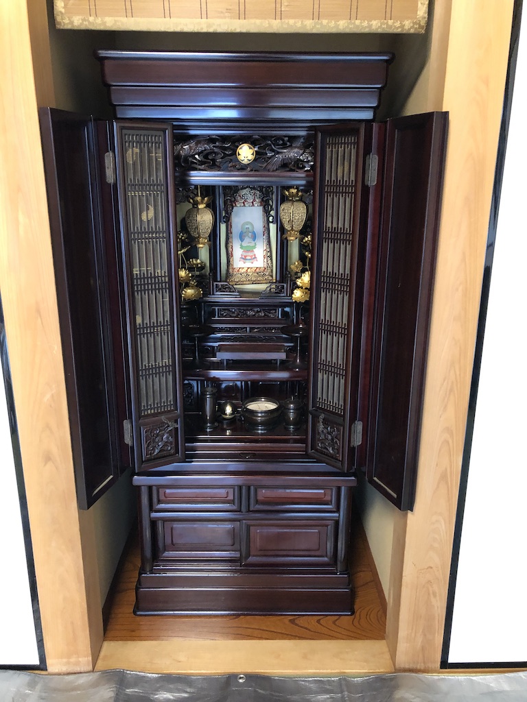 仏壇クリーニング 小川様 2026-03-04 最終更新日時 : 2026-03-04 admin_ueda_j 施工前 施工後 新仏様が修行に旅立たれたとのことで49日前にお家をきれいにしてほしいとご依頼がありました。パッと見はそれほど汚れていませんでしたが、やはり細かい細工のところは埃と汚れが付いていました。すでに25年経過しているとのことでしたので、紗(網戸)と金紙も交換いたしました。この二つは特に経年劣化で脆くなるので20年経過したら交換をおすすめしています。